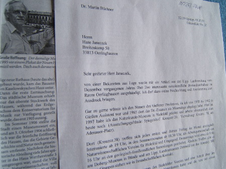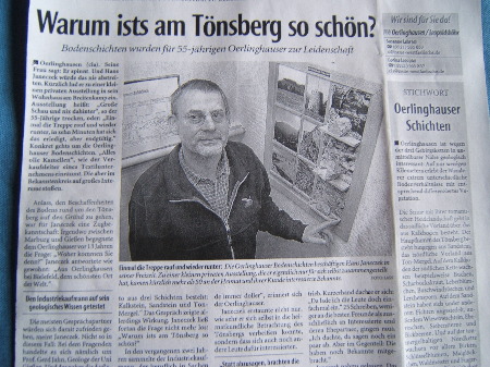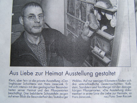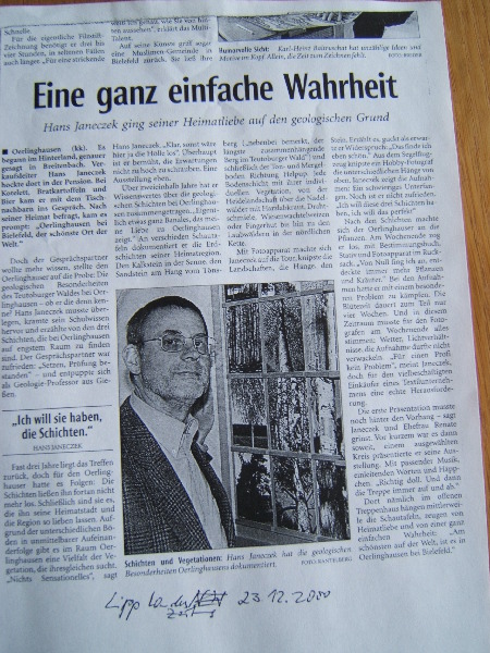 Herzlich willkommen zur kleinen privaten Ausstellung `Oerlinghauser Schichten`- eine heimatliche Betrachtung des Teutoburger Waldes bei Oerlinghausen. Eingeladen sind: Freunde, Verwandte und Menschen, die Verständnis für die Schönheiten unserer Heimat haben! Bewußt ein sehr enger Kreis! Dazu auch Oerlinghauser Handwerker,die mich unterstützt haben und bei einigen" Fummelarbeiten" Interesse an der Sache gezeigt haben. Geburt der Idee: Bereits im Jahr 1987 lernte ich während einer Geschäftsreise im kleinen Ort Breidenbach im "Hinterland" zwischen Siegen und Giessen Prof. Gerd Jahn kennen. Im lockeren Gespräch -woher kommen Sie- (ich sage generell aus Oerlinghausen bei Bielefeld - der schönste Ort der Welt). Dann kam das Wort Heimat und die Frage: Kennen Sie die besonderen Bodenbeschaffenheiten Ihrer Heimat? (Prof.Jahn war seinerzeit Geograph an der UNI Giessen) - - - - - - - Unsere liebliche Landschaft am Teuto macht es dem Fremden nicht leicht, denn sie prunkt nicht mit ihren Schätzen. Vielmehr laden die zahlreichen romantischen Winkel, die anmutigen und versteckten Kleinode dazu ein gesucht und gefunden zu werden. - Dem interessierten Wanderer allerdings erschließen sich Kostbarkeiten von ausgesuchter Qualität: Auf engstem Raum von nur wenigen Kilometern erlebt er durch die extrem unterschiedlichen Bodenverhältnisse entsprechend differenzierte Vegetationen: Von der Senne mit ihrer romantischen Heidelandschaft über den KALKBODEN der südlichen Kette, den Hauptkamm des Tönsberges - SANDSTEIN - , und die nördliche Kette = TON-MERGEL. Diese Gegebenheiten bestimmen eine einzigartige Landschaft, die leider oder Gott sei Dank vom breiten Publikum nicht wahrgenommen wird. Es liegt nicht bei mir, hieraus Schlüsse zu ziehen. Wichtig ist: Wir alle fühlen uns hier wohl und freuen uns, hier leben zu dürfen! Ich habe mich bemüht, diese Realität in eine sachlich begründete, teilweise sogar wisenschaftliche Dokumentation zusammenzufassen, gemixt mit meinen eigenen Worten ist der Text in der Ausstellung zu lesen. Eine Erwähnung wert ist sicher noch, daß die Erstellung der Dokumentation doch erheblich mehr Arbeit und Mühen gemacht hat, als ursprünglich angenommen. Von der ersten Foto-Serie im Kalksteinbruch Foerth im Spätsommer 1998 bis heute sind immerhin 2 Jahre vergangen! - Ich bin noch kein Rentner, die Sonne scheint nicht jeden Tag, manche Fotos waren verwackelt, einige Blumen blühen nur 4 Wochen im Jahr; d.h. die selbstgestellte Aufgabe konnte nur mit großer Ausdauer und Hingabe gelingen. Beides habe ich in meinem früheren Leben als Langstreckenläufer genügend trainiert. Ob das Werk gelungen ist, entscheiden die Betrachter.